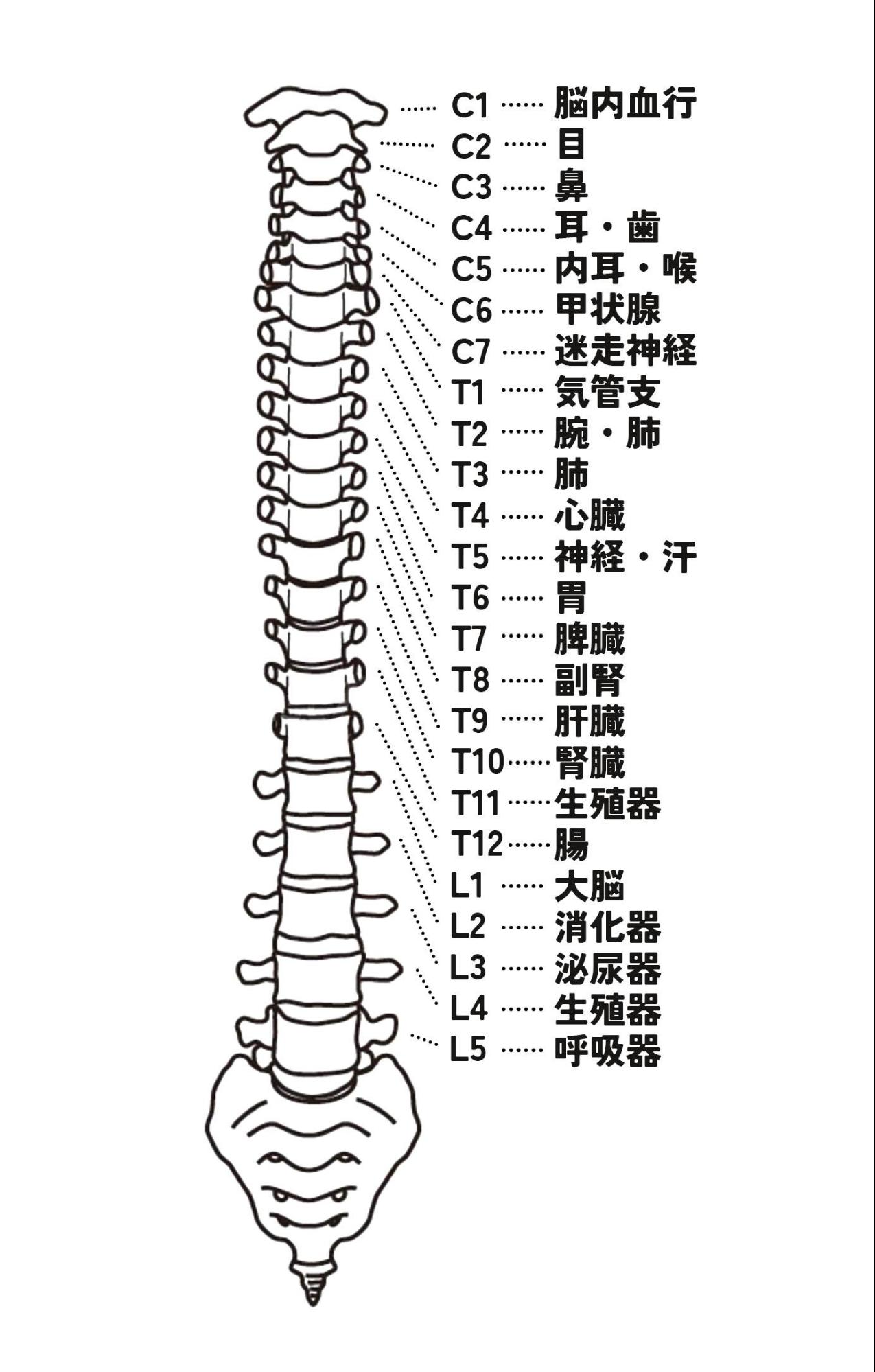 各椎骨は臓器と神経でつながっており、臓器に変動があると対応する椎骨がねじれたり、左右に傾いたりと変動があらわれます。