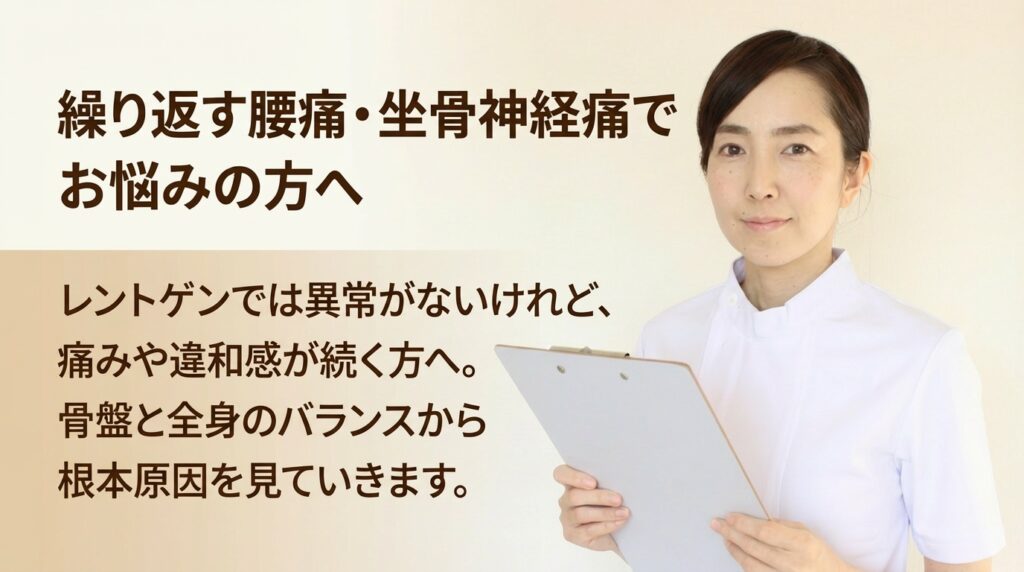 「腰が悪いから腰だけを治す」という考えではなく、全身のつながりを整えることで、腰の負担を軽くしていきます。慢性的な腰痛や繰り返す痛みでお悩みの方も、どうぞ一度ご相談ください。