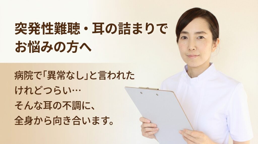耳鳴りについて「キーン」「ジー」という音が続く、静かな場所ほど気になる、耳の奥が詰まった感じがする——耳鳴りは、耳そのものだけでなく、首・足・股関節まわりなど全身の状態が関係して起こることが多い症状です。